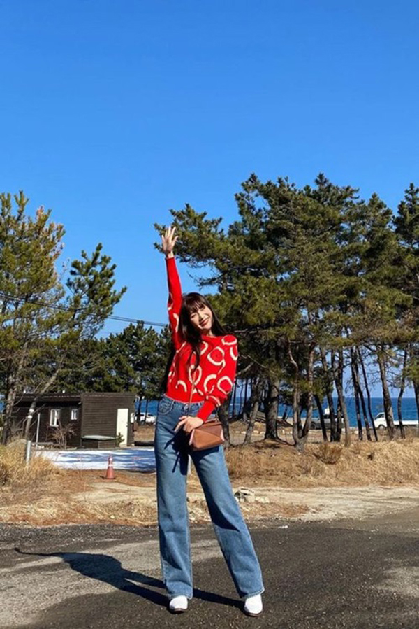 Nếu đến chúc Tết nhà người yêu hay đi du xuân, bạn gái có thể mix áo len đỏ cùng quần jean và sneaker cho trẻ trung.