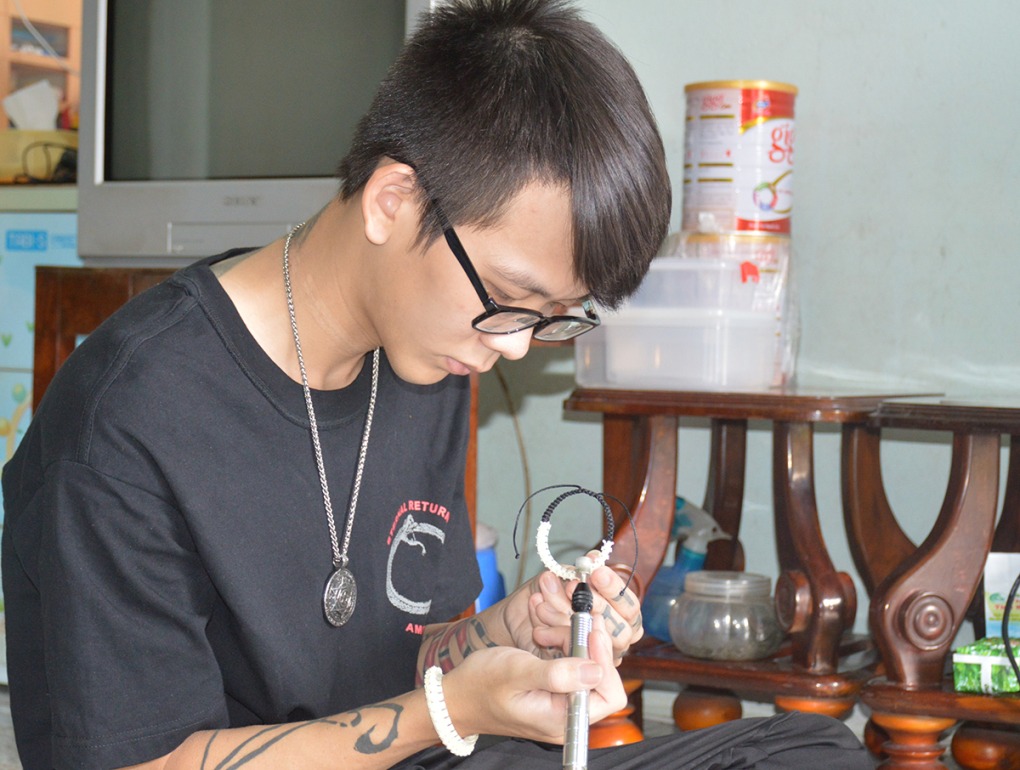 Trịnh Quang Nhã đang làm một chiếc vòng tay. Ảnh: An Minh