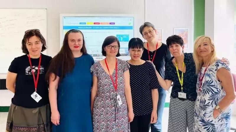 Nguyễn Thu Hương cùng cô giáo người Anh và các bạn Ukraine tại lớp học tiếng Anh ở Sutton.
