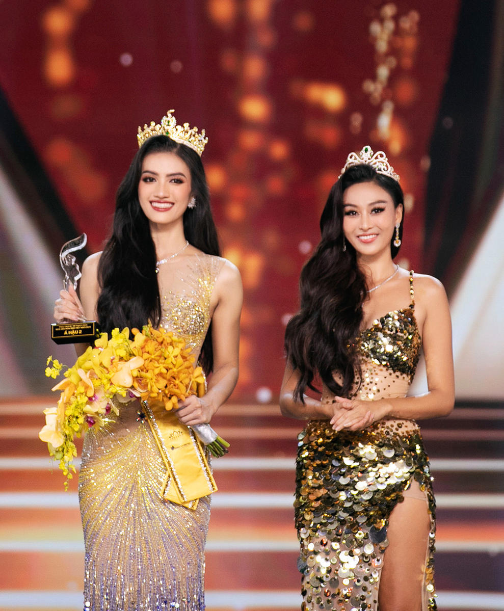 Với sự thể hiện nổi bật, Trương Quí Minh Nhàn (bên trái) là người giữ danh hiệu Á hậu 2 và nhận vương miện từ Á hậu Trần Tuyết Như.