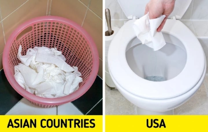 Nếu như ở Mỹ, giấy vệ sinh được thả trực tiếp vào bồn cầu thì hầu hết nhà vệ sinh công cộng ở các nước châu Á đặt một thùng rác bên cạnh để tập kết giấy vệ sinh.