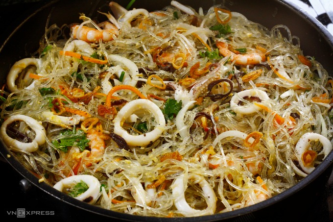 Trút miến đã xào vào chảo tôm, mực, rau củ rồi trộn đều cho hòa quyện. Nêm nếm lại gia vị cho vừa miệng, rắc chút hạt tiêu, hành lá và tắt bếp, gắp ra đĩa, rắc thêm chút hành phi và thưởng thức nóng.