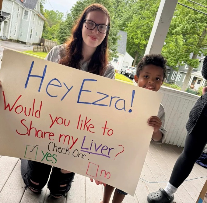 Cô giáo Carissa Fisher cùng Ezra Toczek và tấm bảng "Ezra này, con có muốn nhận gan của cô không?". Ảnh: Carissa Fisher