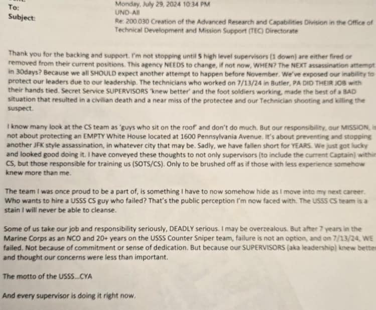 Một người bắn tỉa của Cơ quan Mật vụ đã gởi ra một email cho các nhân viên mật vụ ,cảnh báo rằng cơ quan này nên chuẩn bị cho một vụ á.m s.át khác chống lại ông Donald Trump trước cuộc bầu cử tháng 11.
