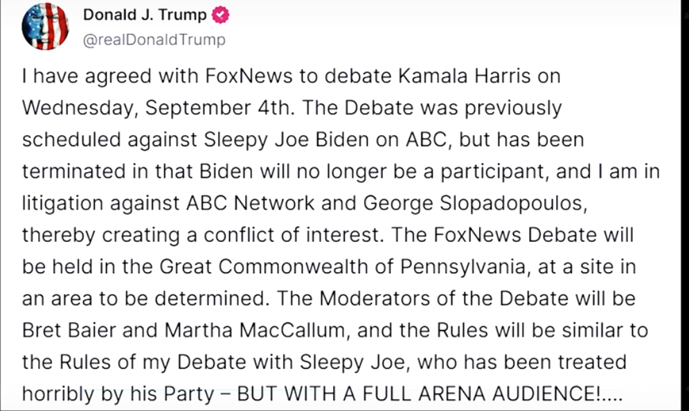 Ứng cử viên tổng thống đảng Cộng hòa Hoa Kỳ Donald Trump đã đồng ý với lời đề nghị của Fox News về việc tổ chức một cuộc tranh luận với Phó Tổng thống Hoa Kỳ đảng Dân chủ Kamala Harris vào ngày 4 tháng 9. Ông Trump cho biết trong một bài đăng trên Truth Social vào cuối ngày thứ Sáu (ngày 2 tháng 8) rằng “Các quy tắc sẽ tương tự như các quy tắc trong cuộc tranh luận của tôi với Sleepy Joe, người đã bị đảng của mình đối xử tệ bạc, nhưng có khán giả đầy đủ tại buổi tranh luận”. Ông Trump ám chỉ đến Tổng thống Joe Biden, người đã rút lui khỏi cuộc tái tranh cử của mình. Bài viết của ông Trump đã bị xóa trong vài phút trước khi được đăng lại, với việc Trump đưa ra đề nghị của mình về một cuộc gặp gỡ lớn hơn (tall hall) vào cùng ngày nếu bà Harris “không muốn hoặc không thể tranh luận”. Phó tổng thống Harris đã trả lời vào tháng trước rằng bà “sẵn sàng” sau khi Fox News đề nghị cuộc tranh luận tổng thống giữa hai ứng cử viên vào ngày 17 tháng 9. Sau khi tổng thống Biden rút lui khỏi cuộc tranh cử ngày 21 tháng 7 và ủng hộ bà Harris, ông Trump cho biết ông sẽ không tranh luận với bà vì bà không phải là ứng cử viên chính thức. Để chứng minh cho việc bà không được ủng hộ, ông nói thêm rằng cựu Tổng thống Barack Obama vẫn chưa ủng hộ bà. Nhưng cựu tổng thống Obama đã lên tiếng ủng hộ một ngày sau đó, và vào thứ sáu, bà đã bảo đảm được số phiếu đại biểu cần thiết để giành được đề cử của đảng Dân chủ.