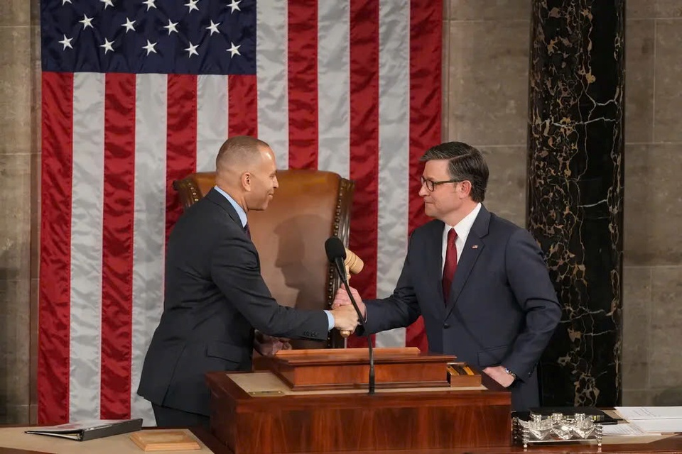 Sau khi tái đắc cử làm chủ tịch Hạ viện, ông Mike Johnson đã nhận búa từ Hạ nghị sĩ Hakeem Jeffries, lãnh đạo đảng Dân chủ của Hạ viện. Ảnh: New York Times.