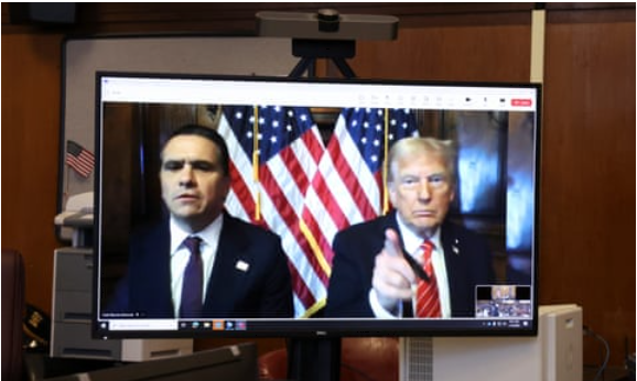 Ông Donald Trump xuất hiện qua màn hình trong phiên tòa tuyên án ở New York vào ngày 10-1. Ảnh: Pool/Reuters.