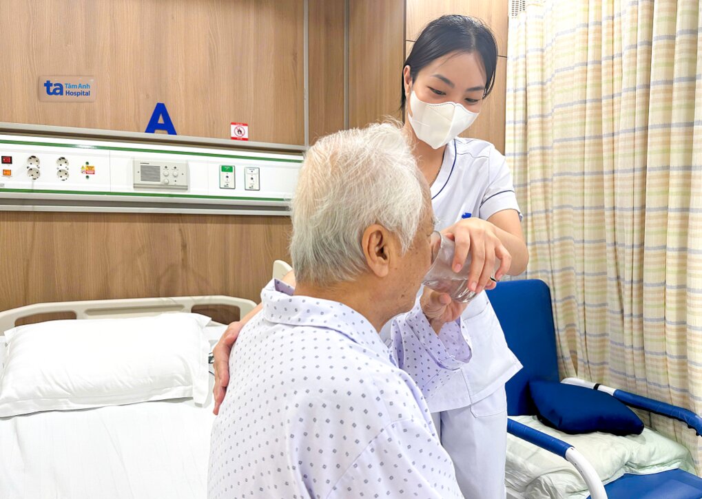 Nhân viên y tế hỗ trợ cụ Khái uống nước trong quá trình tập phục hồi chức năng sau đột quỵ. Ảnh: Bệnh viện Đa khoa Tâm Anh