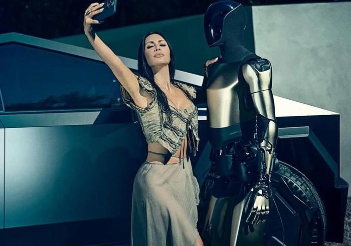 Một bức ảnh cho thấy ngôi sao truyền hình Mỹ tạo dáng trên thùng xe bán tải điện Cybertruck, trong khi một bức ảnh khác có cảnh cô đang âu yếm một chú robot của Tesla gần bãi biển.