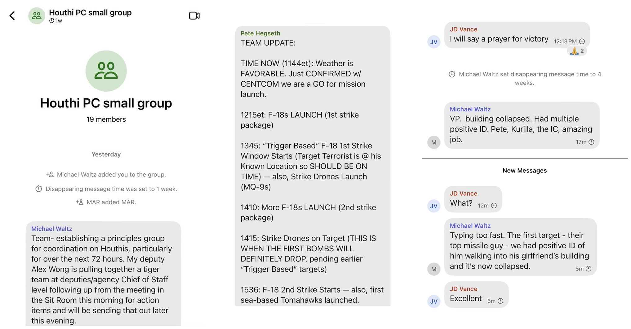 Nhóm chat gồm các quan chức Chính phủ Mỹ như Cố vấn an ninh quốc gia Mike Waltz, Bộ trưởng Quốc phòng Pete Hegseth... Nội dung trao đổi liên quan đến kế hoạch tấn công các mục tiêu Houthi ở Yemen diễn ra hai ngày sau đó.