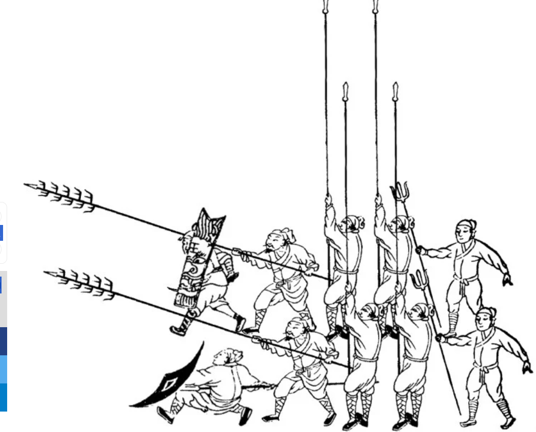 Trong đội hình này, 2 người dùng trúc xoa được che chắn ở phía trước, hai bên sườn và có thể thoải mái hành động. Trong trường hợp hải tặc đánh bại nhóm binh sĩ dùng kiếm, trúc xoa và giáo dài, 2 người cầm đinh ba đi sau cùng có thể kết liễu chúng.