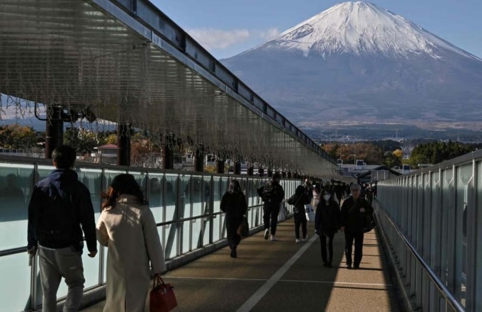 Du khách mua vé để leo núi Phú Sĩ qua đường mòn Yoshida. Ảnh: AFP
