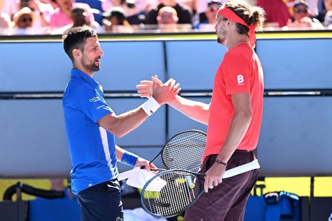 Djokovic (trái) bắt tay chúc mừng Zverev ở bán kết Australia Mở rộng 2025, trên sân Rod Laver, Melbourne, Australia hồi tháng Một. Ảnh: ATP