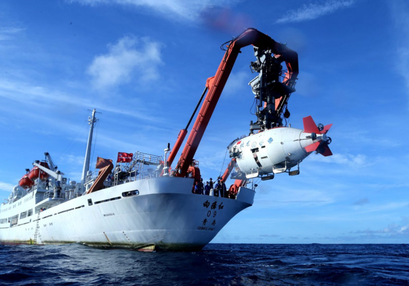 Tàu lặn khai thác biển Jiaolong của Trung Quốc đang chuẩn bị lặn xuống rãnh Yap ở phía tây Thái Bình Dương. Ảnh: Xinhua