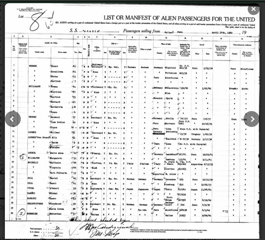 Chính bởi sự thiếu hụt thị thực nghiêm trọng này mà các cơ quan thực thi pháp luật của chính quyền FDR có cái cớ để bắt giam những hành khách Đức vô tội. Chính sách khắc nghiệt của Roosevelt đã tước đoạt sạch tài sản của người Đức ở Peru và biến họ thành kẻ phạm luật ở cái nước xa lạ. Franklin Roosevelt không chỉ đẩy gia đình Lorenz vào tình cảnh khó khăn mà chính phủ bất lực của ông cũng phủ bóng đen lên tính cách của ông cố tôi. Chính quyền Mỹ lo ngay ngáy việc các điệp viên ĐQX có thể tái chiếm chính phủ các quốc gia Mỹ Latinh bất kỳ lúc nào, song FBI cam đoan rằng chỉ có 6 điệp viên Đức tại những đất nước đã gửi tù nhân sang Mỹ để giam giữ. Một trong số những điệp viên được xác định trong số đó là Heinrich Loeschner từ Ecuador.