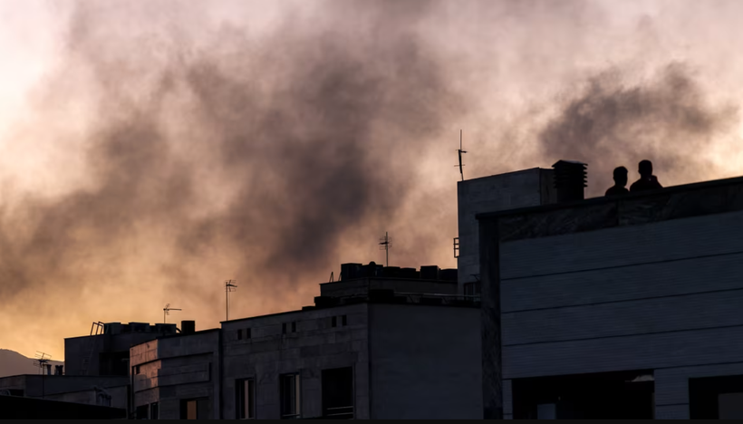 Người dân Iran đứng trên nóc tòa nhà giữa làn khói bốc lên nghi ngút sau cuộc không kích của Israel nhằm vào Tehran, thủ đô Iran, ngày 17/6. Ảnh: AFP.