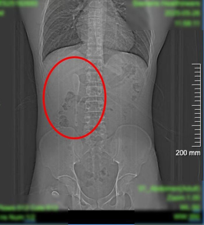 Các bác sĩ đã tiến hành khám sức khỏe và chụp CT để tìm nguyên nhân. Lúc đầu, bệnh nhân nghĩ rằng mình đã vô tình nuốt phải một vật bằng nhựa. Tuy nhiên, những gì họ tìm thấy là một chiếc thìa gốm dài 15 cm mắc kẹt trong tá tràng.