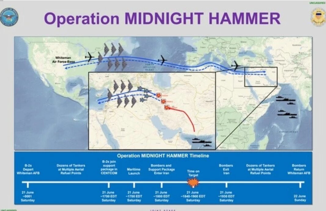Theo Chủ tịch Hội đồng Tham mưu trưởng Liên quân, Đại tướng Dan Caine, chiến dịch bắt đầu khi 7 máy bay ném bom tàng hình B-2 Spirit cất cánh từ căn cứ Whiteman ở bang Missouri, Mỹ vào chiều 21/6.