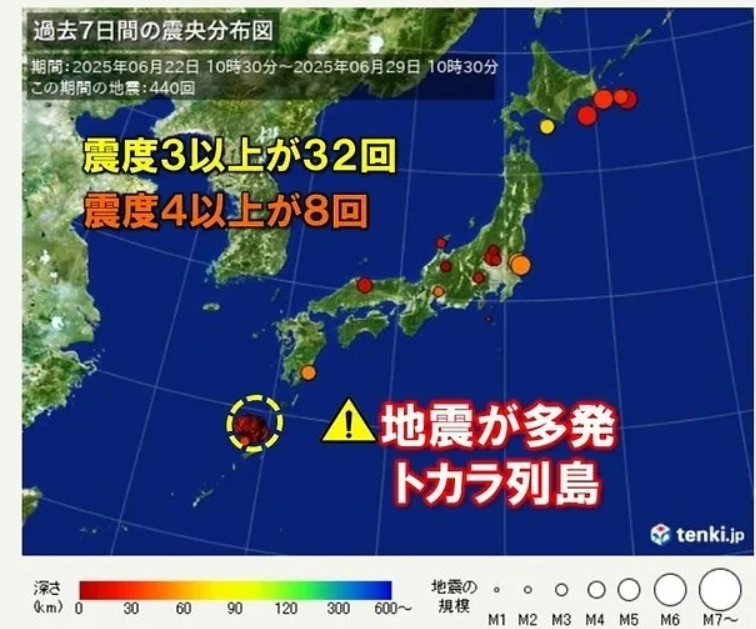 Bắt đầu từ ngày 21/6, tại quần đảo Tokara thuộc khu vực ngoài khơi tỉnh Kagosshima – miền Nam Nhật Bản, đã liên tục xảy ra hàng trăm trận động đất lớn nhỏ. Đặc biệt, bắt đầu từ đêm qua (1/7), tần suất của chuỗi động đất liên hoàn lần này trở nên dày đặc hơn.