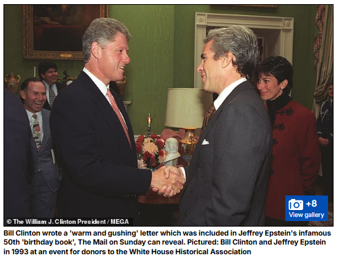 Tờ Mail on Sunday tiết lộ rằng Bill Clinton đã viết một bức thư "ấm áp và nồng nhiệt" được đưa vào "cuốn sách mừng sinh nhật" khét tiếng lần thứ 50 của Jeffrey Epstein.