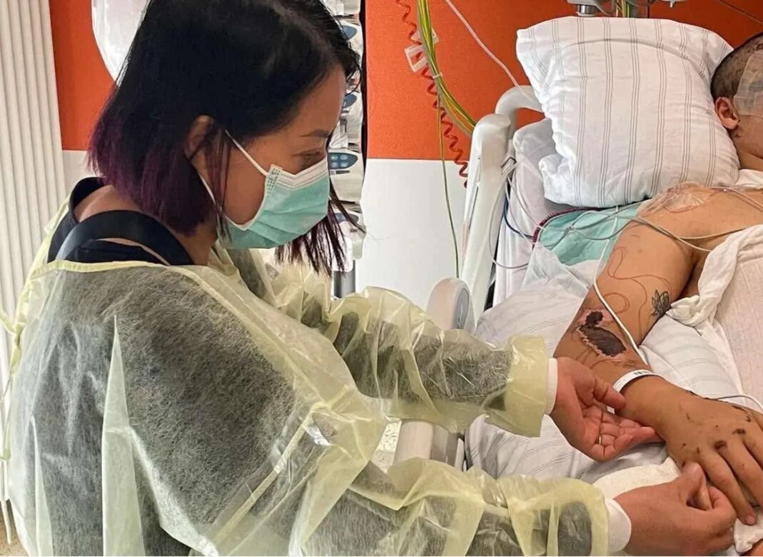 Mẹ Trung Hiếu túc trực chăm sóc con trai trong bệnh viện tại Đức. Ảnh: GoFundMe.