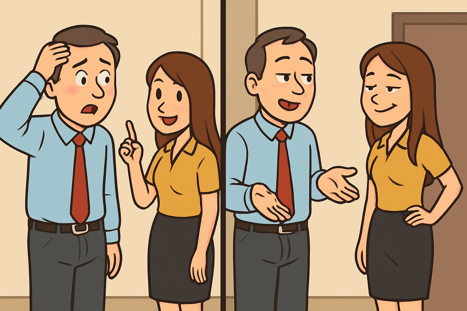 Một ông sếp đi làm mà quên kéo khóa quần. Cô thư ký nhìn thấy, liền nhắc khéo: