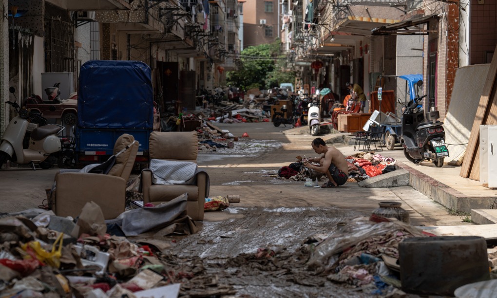 Người dân lau rửa đồ đạc sau khi mưa tạnh tại tỉnh Quảng Đông hôm 8/8. Ảnh: AFP