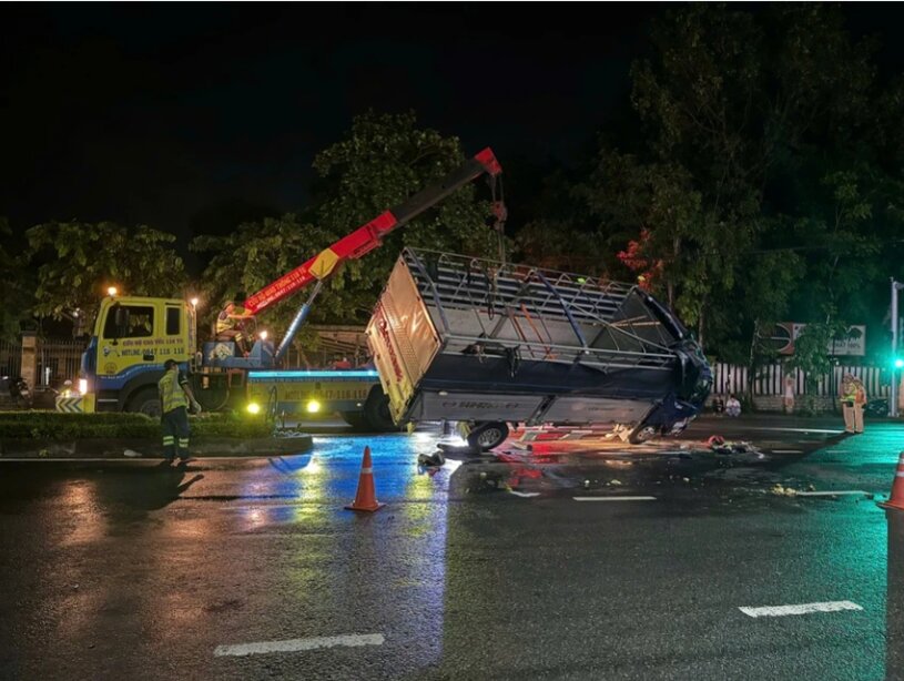 Thời điểm xảy ra tai nạn, tuy trời đang mưa to nhưng trên đường vẫn có phương tiện lưu thông. Bên trong cabin xe tải có 3 người nhưng may mắn không bị thương vong. Vụ tai nạn làm phần đầu xe tải, trụ biển báo giao thông, đèn chiếu sáng và camera trên trụ bị hư hỏng.