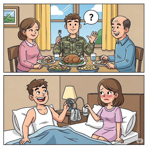 Tối hôm đó, hai vợ chồng lâu ngày mới gặp lại, âu yếm nhau trong phòng. Cô vợ ngượng ngùng, cứ đẩy chồng ra, miệng thì lẩm bẩm: – Cái lon đại úy của anh cứ đâm vào cái lon đại úy của em...