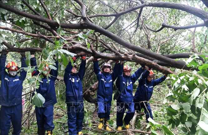 Lực lượng cứu hộ dọn dẹp cây đổ trên đường khi bão Kajiki quét qua Tam Á, Hải Nam, Trung Quốc, ngày 25/8/2025. Ảnh: THX/TTXVN
