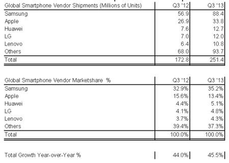 “Samsung đã xuất xưởng nhiều smartphone gấp hai lần so với Apple trong quý vừa qua”, nhà phân tích Neil Mawston của Strategy Analytics nhận xét. “Trong khi số lượng điện thoại Galaxy S4 bán ra chậm hơn thì nhu cầu đối với dòng điện thoại Galaxy Note 3 tăng mạnh mẽ. và, chiếc điện thoại giá rẻ GalaxyY đã tiếp tục giúp doanh số của Samsung tăng lên chóng mặt”.