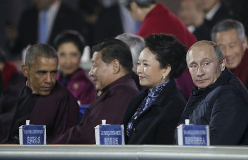 Trong lễ khai mạc APEC tại trung tâm hội nghị rộng lớn bên hồ ở ngoại ô Bắc Kinh, ông Obama và ông Putin sánh bước hai bên Chủ tịch Trung Quốc Tập Cận Bình nhưng cả hai người đều không mỉm cười.