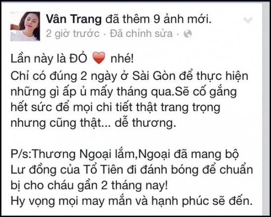 Nữ diễn viên của "Cô dâu đại chiến" vừa chia sẻ tin vui trên trang facebook cá nhân của mình. Theo đó, Vân Trang chọn sắc đỏ làm tông màu chủ đạo cho hôn lễ. Mọi vật dụng từ hoa, quà, thiệp... đều do một tay nữ diễn viên và các thành viên trong gia đình cô chung tay chuẩn bị. Lễ đính hôn sẽ được diễn ra vào 9h sáng mai tại tư gia. Tuy nhiên, Vân Trang sẽ tiến hành lễ đính hôn thật kín đáo.
