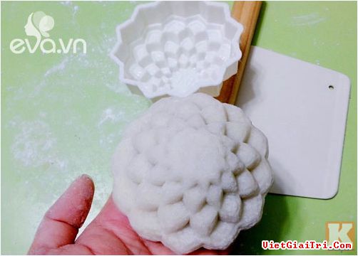 Mang bột ra, chia theo tỉ lệ 2 phần vỏ 1 phần nhân, rắc ít bột khô lên bàn lấy 1 miếng bột cán vừa mỏng rồi cho nhân vào giữa túm lại sao cho kín nhân. Rắc 1 ít bột khô vào khuôn, xoa đều bột khô lên bánh để khi đóng bánh sẽ không bị dính khuôn, cho bánh vào khuôn ấn chặt tay đều các góc, nhẹ nhàng gõ và gỡ bánh ra.