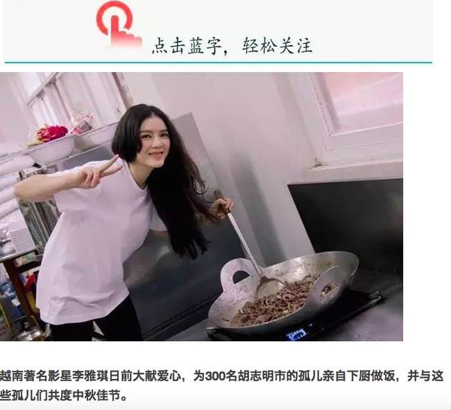 Trang tin này viết: "Ngôi sao điện ảnh nổi tiếng Việt Nam Lý Nhã Kỳ tài trợ nấu ăn cho 300 trẻ em mồ côi khuyết tật. Người đẹp, tâm lại càng đẹp hơn.Mấy ngày trước, ngôi sao nổi tiếng Việt Nam Lý Nhã Kỳ đã có chuyến từ thiện lớn. Người đẹp tự tay xuống bếp nấu ăn cho hơn 300 cô nhi ở TP.HCM và cùng đón trung thu cùng các em nhỏ. Lý Nhã Kỳ chia sẻ: Do công việc thường ngày bận rộn nên không có cơ hội xuống bếp. Lần này người đẹp xuống bếp trổ tài với món bún bò xào".