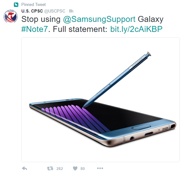 Ủy ban An toàn Sản phẩm Tiêu dùng Mỹ đã đưa ra thông cáo chính thức về Galaxy Note 7. Theo đó, Ủy ban an toàn cho hay các vụ cháy nổ liên quan đến pin của Samsung Galaxy Note 7 đã buộc họ phải lên tiếng và kêu gọi người dùng tắt nguồn chiếc điện thoại của họ.