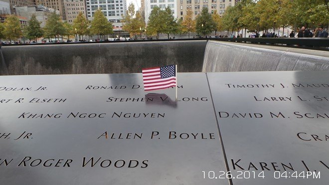 Tên anh Nguyễn Ngọc Khang được khắc trên tấm bia đá bao quanh hồ nước Đài tưởng niệm quốc gia cùng gần 3.000 tên các nạn nhân khác trong vụ khủng bố kinh hoàng ngày 11/9/2001. Ảnh: Nyclips