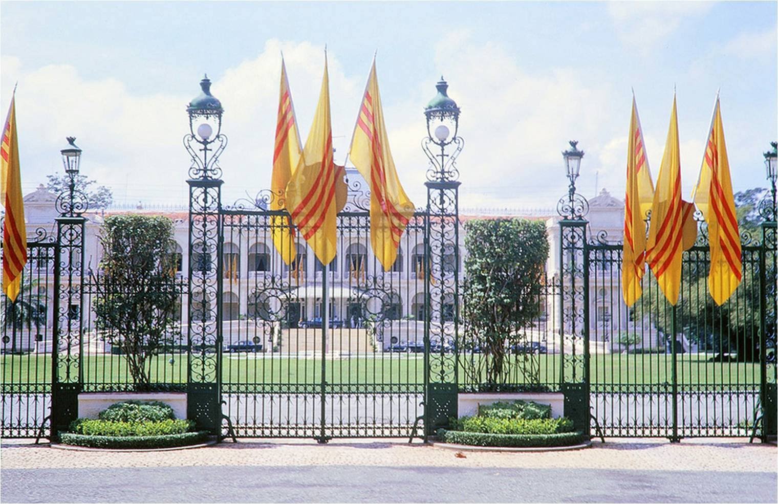 Mặt tiền Dinh Độc Lập với 3 tầng ngang và cột cờ sổ dọc tạo thành chữ Vương.