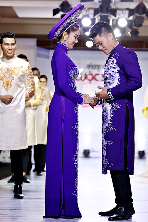 Lê Phương và bạn trai - ca sĩ Trung Kiên - diễn phần mở màn cho bộ sưu tập "Duyên phận" của nhà thiết kế Minh Châu. Đây là lần đầu tiên người yêu của nữ diễn viên trình diễn thời trang. Anh có phần bối rối khi sánh bước bên cô.