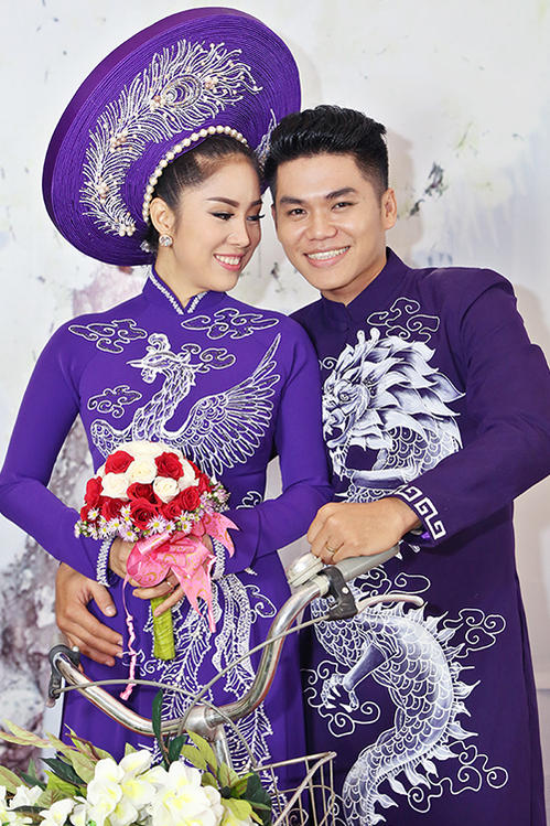 Đôi nghệ sĩ diện áo dài long phụng thể hiện tình cảm gắn bó thắm thiết.
