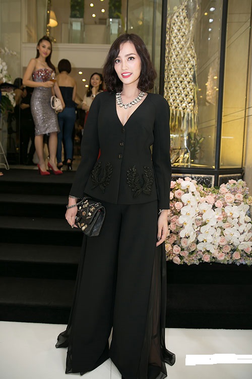 Trương Ngọc Ánh trở nên "mũm mĩm" với chiếc váy đen khoét ngực táo bạo kết hợp với áo choàng da thô cứng.