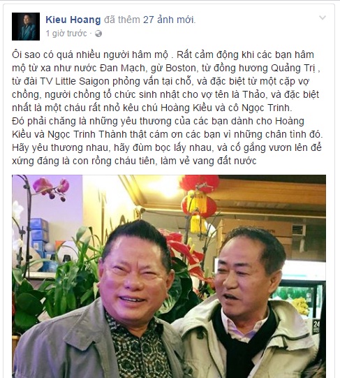 Đó phải chăng là những yêu thương của các bạn dành cho Hoàng Kiều và Ngọc Trinh Thành thật cám ơn các bạn vì những chân tình đó. Hãy yêu thương nhau, hãy đùm bọc lấy nhau, và cố gắng vươn lên để xứng đáng là con rồng cháu tiên, làm vẻ vang đất nước".