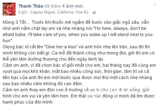 Mới đây, ca sĩ Thanh Thảo chia sẻ trên trang cá nhân khiến không ít những người yêu thương cô lo lắng: "Mùng 3 Tết.... Trước khi thuốc mê ngấm để bước vào giấc ngủ sâu, vẫn nhớ anh nắm chặt tay em và nhẹ nhàng nói "I'm here, always, don't be afraid babe. I'll take care of you. when you wake up I will stand next to you hun" .