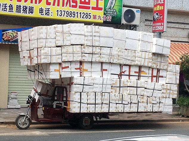 Một chiếc xe 3 bánh chở 200 thùng hàng tại tỉnh Quảng Đông, Trung Quốc
