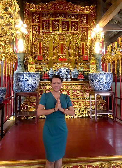 Ngọc Huyền (trái) vừa từ Mỹ trở về nước để tập luyện cho thí sinh của chương trình "Đường đến danh ca vọng cổ". Chị đến dâng hương tại nhà thờ tổ nghiệp của Hoài Linh (phải) ở phường Long Phước, quận 9, TP HCM.
