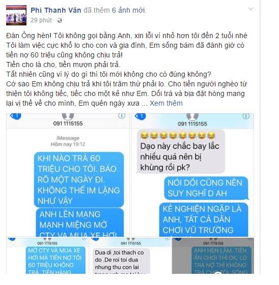 Phi Thanh Vân sau khi chia tay chồng trẻ Bảo Duy luôn xuất hiện với những hình ảnh quyến rũ và xinh đẹp hơn.Mới đây Phi Thanh Vân tiếp tục viết tâm thư tố cáo chồng trẻ nợ tiền không trả.Dòng trạng thái của Phi Thanh Vân nhanh chóng thu hút sự chú ý của dư luận.