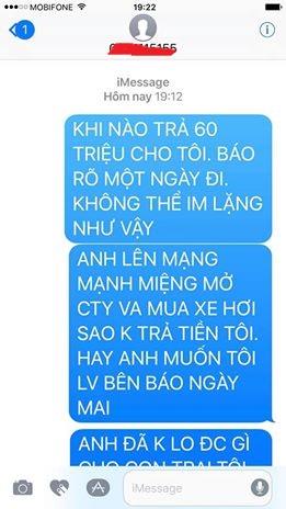 Vậy mà 60 triệu không chịu trả hẹn lần lựa mãi. Đưa ra yêu sách gặp con đủ điều, mà không muốn lo cho con một đồng nào! Tiền Nợ thì không trả. Hỏi tới thì nói không có tiền!..... chửi tôi khùng điên! Còn hăm dọa khi tôi cho sự thật lên báo, và facebook! Em nghĩ tôi sợ Em sao? Tôi chưa bao giờ biết sợ bất cứ điều gì nhất là liên quan tới Em. Chúng chỉ làm tôi khinh thường sự xấu xa và đàn bà tính của Em mà thôi. Hãy để con trai tôi nhìn thấy con người xấu xa Bỉ ổi của cha nó.