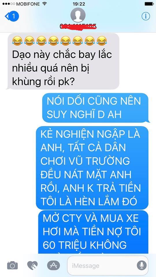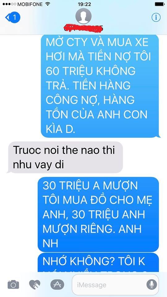 “Đàn Ông hèn! Tôi không gọi bằng Anh, xin lỗi vì nhỏ hơn tôi đến 2 tuổi nhé Tôi làm việc cực khổ lo cho con và gia đình, Em sống bám đã đành giờ có tiền nợ 60 triệu cũng không chịu trả! Tiền cho là cho, tiền mượn phải trả.
