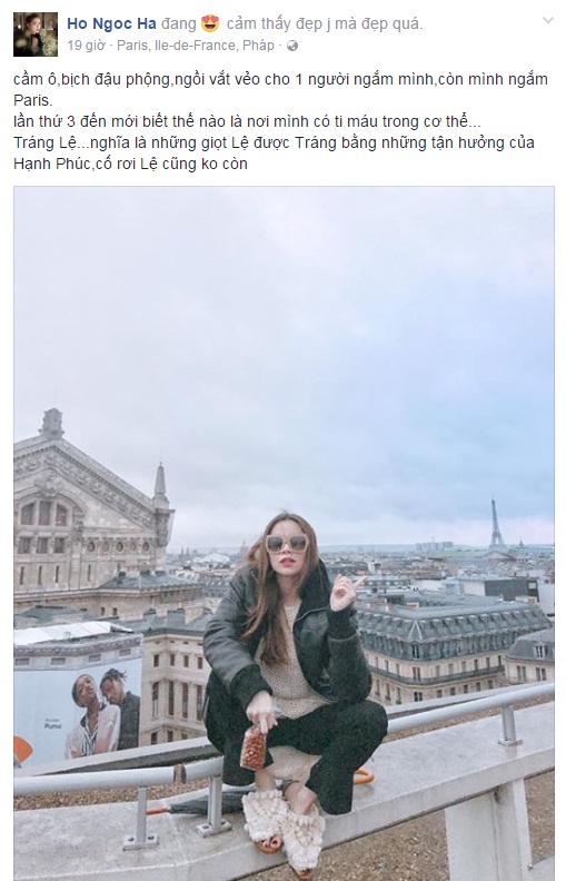 Mới đây, Hồ Ngọc Hà chia sẻ trên trang cá nhân: "Có thằng em hiểu biết về lịch sử, văn hoá và ẩm thực cùng với những cơ hội của mình quả là sự cộng hưởng tuyệt vời để khám phá những đất nước của thời trang, ăn uống, lãng mạn và những bữa tiệc xa xỉ để thấy thế giới rộng lớn, xa hoa. Bé vẫn đi tiếp, chưa thể về vì quá nhiều thứ níu chân níu tim... chỉ có 1 thứ ra đi không quay trở lại đó là tiền". Dòng trạng thái của Hồ Ngọc Hà nhanh chóng nhận được rất nhiều sự quan tâm. Được biết, "nữ hoàng giải trí" hiện tại đã rời Milan sang Pháp để nghỉ ngơi du lịch.