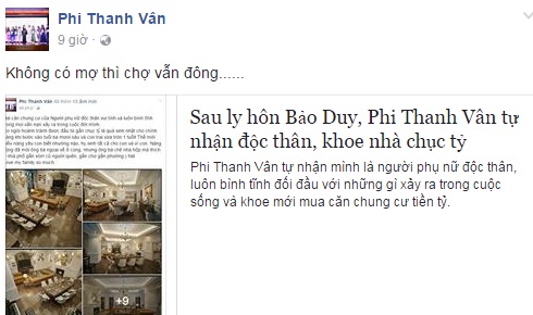 Mới đây nhất, trên trang cá nhân của mình, Phi Thanh Vân bất ngờ đăng tải dòng trạng thái ngắn ngủi "Không có mợ thì chợ vẫn đông" sau khi chia sẻ một trang tin có nội dung "Phi Thanh Vân tự nhận độc thân, khoe nhà chục tỷ". Ngay lập tức, dòng trạng thái của nữ diễn viên "Cô gái xấu xí" đã nhanh chóng thu hút sự quan tâm từ phía cộng đồng mạng. Trong khi nhiều người dành cho người đẹp lời ngợi khen "có cánh" về tài năng thì không ít người đồn đoán rằng, có lẽ nào bà mẹ một con đang "đá xoáy" Bảo Duy khi cho rằng, không có chồng thì cô vẫn có thể tự mình xoay sở, lo chuyện mua nhà cửa cho con trai sau này. Liệu điều này có khiến Bảo Duy đau lòng?